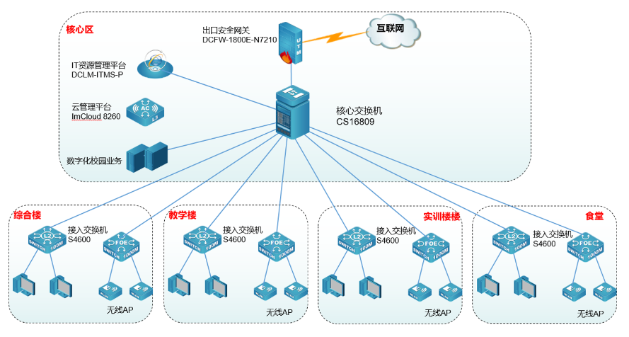 學校此次升級改造采用大二層解決方案,簡化網絡架構,提升網絡的轉發(fā)效率性能,核心交換機采用evo視訊真人官網高端數據中心交換機CS16809,接入采用S4600系列,支持雙鏈路冗余備份,具備先進的綠色環(huán)保技術,為用戶給予高性能、易管理、低成本的千兆到桌面的解決方案。