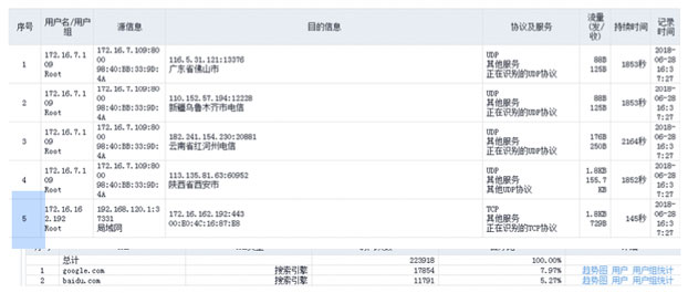 會話記錄:順利獲得檢查完整的會話日志,管理者可以跟蹤網絡中的各種操作。會話記錄包括:源 IP、目的 IP、協議和端口、是否進行 NAT 轉換(可顯示轉換后的 IP 和端口)、七層應用名稱、會話產生的時間和會話持續時間等。