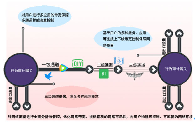 DCBC行為審計網關以 8 Kbps 為粒度,給予精細網絡帶寬管理功能。可根據主機(單 IP、IP 組、用戶組)、服務(服務組)、時間、URL、文件類型等參數,以及各個參數間的靈活組合來實現帶寬的預留、保障和限制。對內網單個主機進行會話和帶寬控制的同時,可對單個主機的多個特定服務(服務組)的帶寬再進行控制。