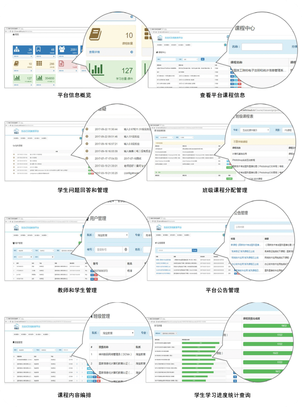 包括教務管理、教學管理、在線培訓、資源課程管理、站內答疑、新聞公告、作業管理、統計分析等模塊 |