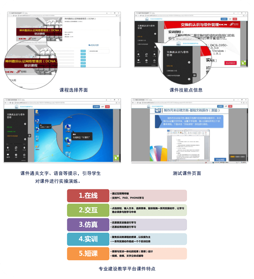 DCTP-50以先進的應用仿真技術開發多種崗位業務場景的仿真環境,以課件資源的形式搭載到實訓云平臺上。將多媒體技術和引導式仿真技術結合,改進課程教學模式,體現網路課程資源的廣泛性、參與性與共享性,突出實訓課程的互動實操性。 |