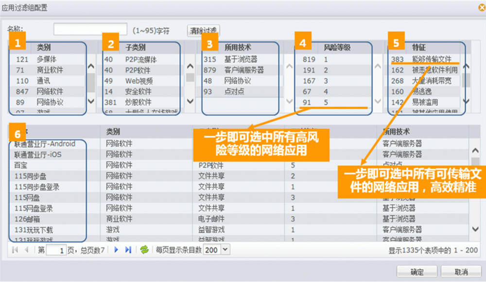 ●精準應用篩選。evo視訊真人官網下一代防火墻給予了精細化的應用篩選機制。用戶可根據應用名稱、應用類別、應用子類別、風險級別、所用技術、應用特征等6大條件。精確篩選出感興趣的應用類型,如具備文件傳輸功能的通訊軟件,或存在已知漏洞、基于瀏覽器的WEB視頻應用等等,從而實現精細化的應用管控。