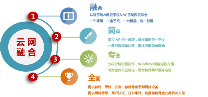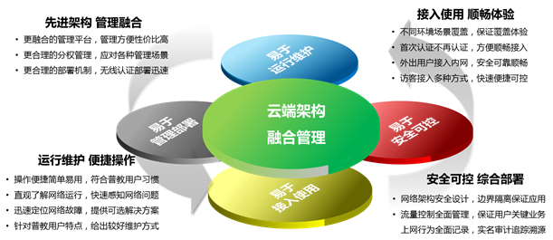 "人 ? 網絡 深度融合管理”,指智能云管理平臺能夠將網絡中的用戶認證管理、用戶權限管理、網絡設備管理、無線AP管理等統一起來,深度融合,并能夠作為后期業務應用的平臺,還可以為其它應用給予相關的標準接口。