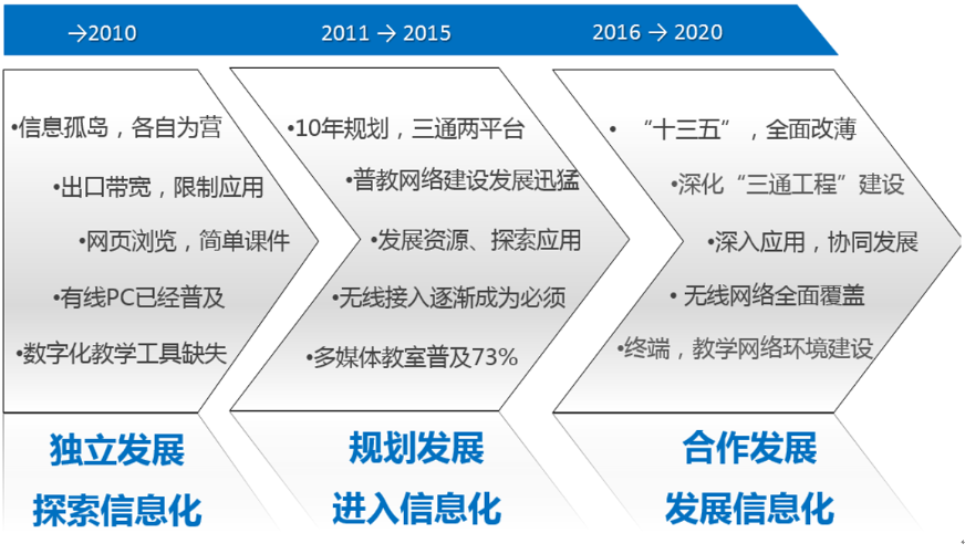 中國(guó)基礎(chǔ)教育信息化開(kāi)展,整體看來(lái)分為三個(gè)階段,即:各校獨(dú)立開(kāi)展階段、政府規(guī)劃開(kāi)展階段和社會(huì)合作開(kāi)展階段。