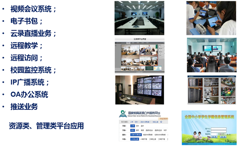 從實(shí)踐上來(lái)看,普教城域網(wǎng)包括為互聯(lián)網(wǎng)及教科網(wǎng)出口、各校園區(qū)覆蓋和接入、兩大基礎(chǔ)平臺(tái)(資源和管理)以及數(shù)據(jù)中心基礎(chǔ)設(shè)施、云計(jì)算平臺(tái)等,包含的業(yè)務(wù)或系統(tǒng)主要有: