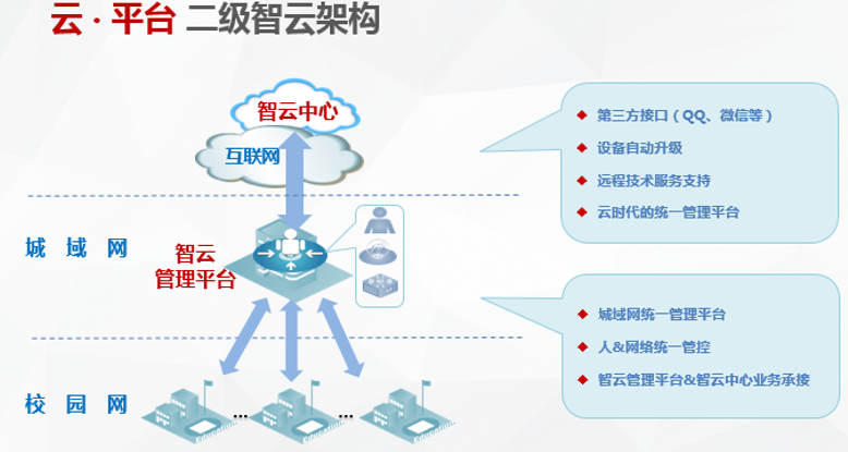 智云管理平臺(tái):部署在無(wú)線城域骨干網(wǎng)(一般指教育局機(jī)房)中,作為城域網(wǎng)統(tǒng)一管理平臺(tái),能夠?qū)⑷?span id='2d2c8'>&網(wǎng)絡(luò)統(tǒng)一管控,同時(shí)與智云中心業(yè)務(wù)承接相關(guān)云業(yè)務(wù)。