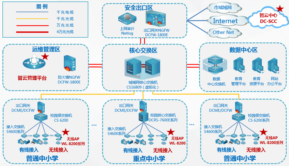 bti必一体育(b-sports) 根據(jù)普教用戶無(wú)線網(wǎng)絡(luò)管理和使用現(xiàn)狀,以及對(duì)業(yè)務(wù)應(yīng)用系統(tǒng)分析,遵從“云網(wǎng)融合 易網(wǎng)無(wú)憂”的新主張,對(duì)原有有線城域網(wǎng)采用了“云 ? 平臺(tái)”二級(jí)智云部署架構(gòu),搭建了簡(jiǎn)單易用的綜合智云管理平臺(tái),部署了無(wú)線網(wǎng)絡(luò)。既實(shí)現(xiàn)了“人 ? 網(wǎng)絡(luò)”的深度管理融合,也為云業(yè)務(wù)的召開(kāi)打下良好的基礎(chǔ)!總拓?fù)浣Y(jié)構(gòu)圖如下: