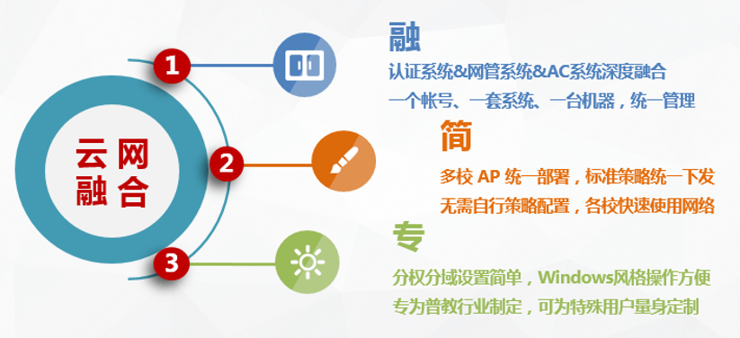 “人?網(wǎng)絡(luò) 深度融合管理”是指智云管理平臺(tái)能夠?qū)⒕W(wǎng)絡(luò)中的用戶認(rèn)證管理、用戶權(quán)限管理、網(wǎng)絡(luò)設(shè)備管理、無(wú)線AP管理等統(tǒng)一起來(lái),深度融合,并能夠作為后期業(yè)務(wù)應(yīng)用的平臺(tái),還可以為其它應(yīng)用給予相關(guān)的標(biāo)準(zhǔn)接口。