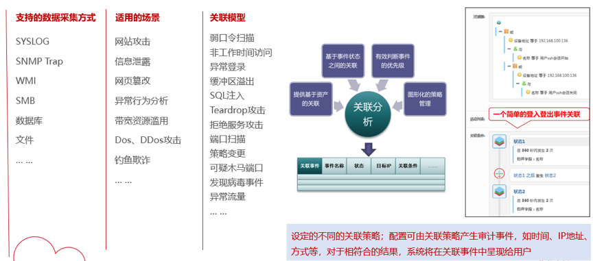 檢驗日審功能的另一個試金石是關聯分析能力。針對日志自動化、集中度、關聯度不夠的問題,evo視訊真人官網DCSSA日志審計系統支持基于規則、統計、情報的分析模型,內置豐富的安全策略模板、高效的實時關聯分析能力、靈活的審計策略,充分發揮日志分析及審計機制的最大效力。幫用戶實現對日志的關聯性處理,讓用戶能有效處理紛雜無序的日志信息。