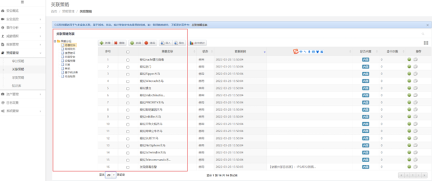 evo視訊真人官網DCSSA日志審計系統除了等保合規場景之外,還有廣泛的應用領域,在惡意軟件檢測、網絡攻擊檢測等方面也能發揮很好的效果,是一款網絡威脅告警利器。在運行過程中,系統充分利用已經內置的場景策略,一旦日志信息中出現關鍵字,系統將會進行統計,超過設定的閾值就產生告警,相關策略提前預置,可以根據業務實際進行靈活調整。